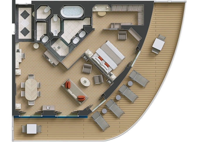 | O2 - Owner's Suite 2 119 - 129 m² (vrátane balkóna 12 m²). Owners Suite S1 spojená s Panorama Suite PA 9. paluba - stred. Max 5 osôb. | 51 400 € 51 400 € za osobu |