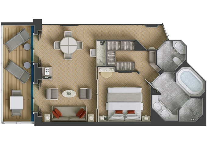 | SV - Superior Veranda Suite 30 m² + balkón 6 m². 7,8,9. paluba. Max 3 osoby. | 12 150 € 12 150 € za osobu |