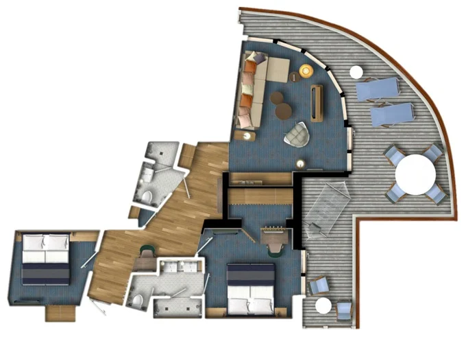 | SPNO - Panorama Suite 73-77 m² + balkón 31-36 m² so stolom, ležadlami a hojdacou sieťou. 2 spálne a 2 kúpeľne. 6,9,10. paluba. Max 6 osoby. Výhody Suite. | 9 366 € 3 122 € za osobu | ||